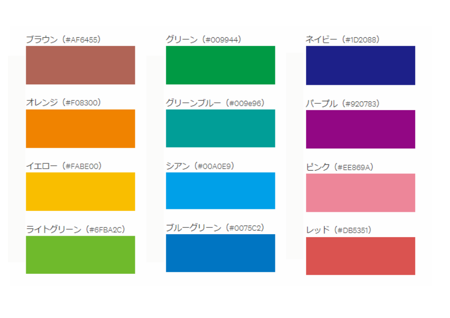 ブラウン(#AF6455)オレンジ(#F08300)イエロー(#FABE00)ライトグリーン(#6FBA2C)グリーン(#009944)グリーンブルー(#009e96)シアン(#00A0E9)ブルーグリーン(#0075C2)ネイビー(#1D2088)パープル(#920783)ピンク(#EE869A)レッド(#DB5351)